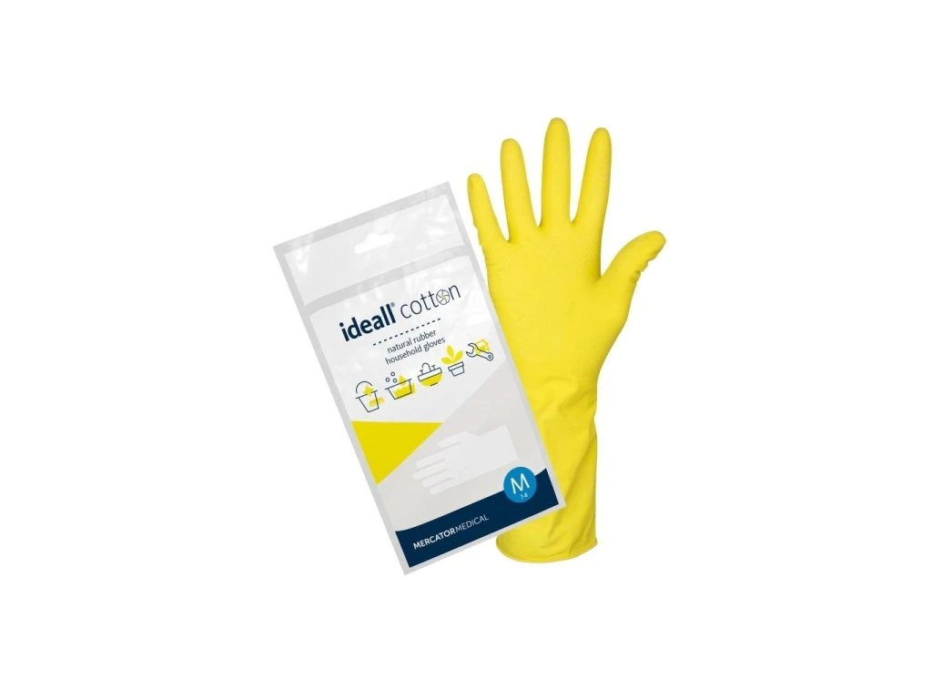 Technické a úklidové latexové rukavice, žluté s vnitřním semišováním, balené po 1 páru. Texturovaný povrch v úchopové části, manžeta má rovnoměrně rolovaný okraj. Dostupné...