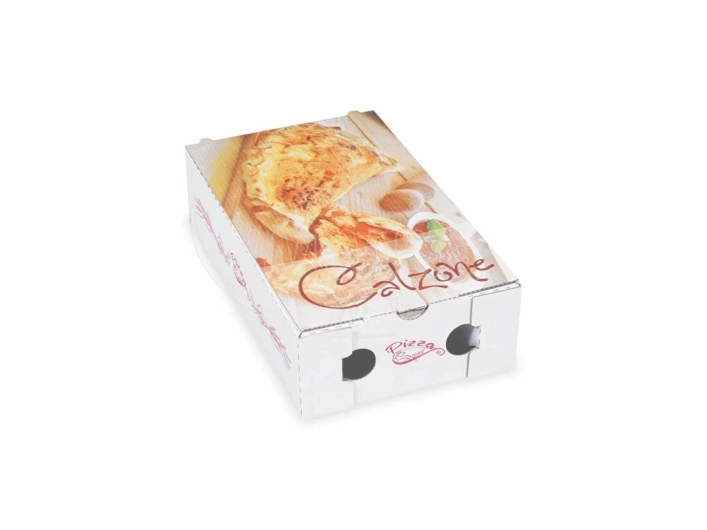Krabice na pizzu (mikrovlnitá lepenka) R4 Calzone bílá s potiskem 17 x 28 x 7,5 cm [100 ks]